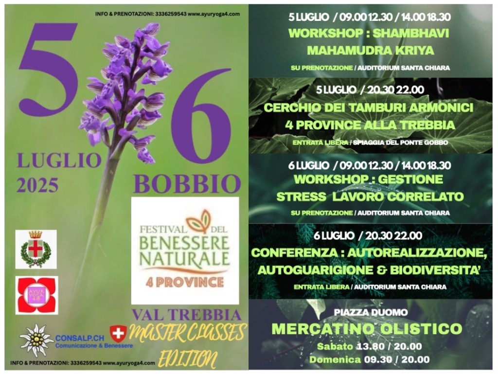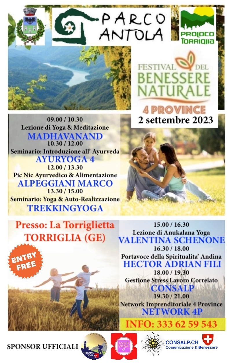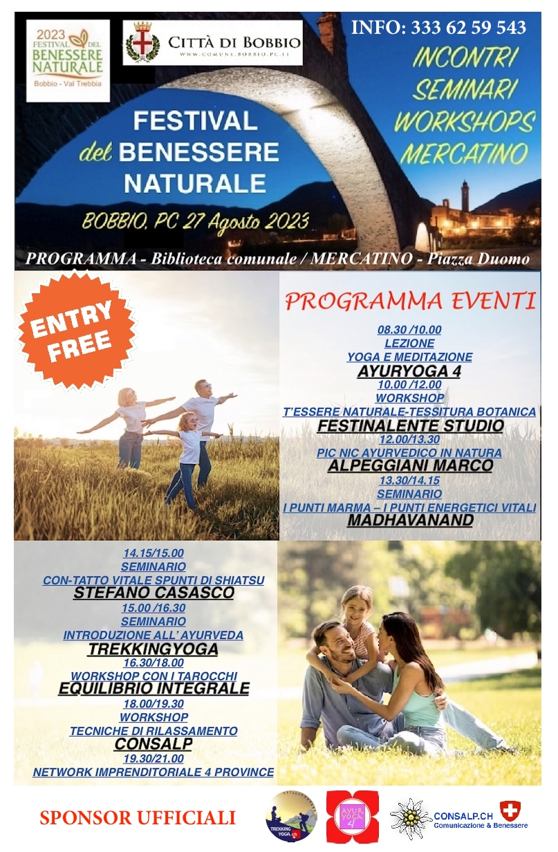 NATURA, YOGA, AYURVEDA, TERAPIE OLISTICHE INTERNAZIONALI, MEDITAZIONE, ALIMENTAZIONE, PRODOTTI E PRODUTTORI LOCALI, TREKKING, GESTIONE DELLO STRESS LAVORO CORRELATO, ERBORISTERIA, ECOLOGIA, MUSICA, SPERIMENTAZIONE e TANTA VOGLIA DI CONDIVIDERE vi offriranno giornate per conoscere e approfondire in via amorevole e sostenibile il benessere individuale e sociale nello spirito NATURALISTICO ed AMBIENTALE.